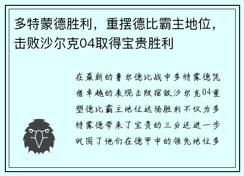 多特蒙德胜利,重摆德比霸主地位,击败沙尔克04取得宝贵胜利